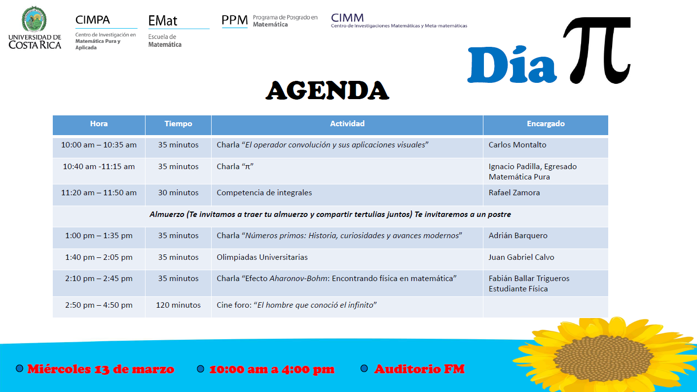 EL CIMPA los invita al día Pi, se realizará a las 10am en el auditorio de Física-Matemática, para más información ver las imágenes adjuntas.