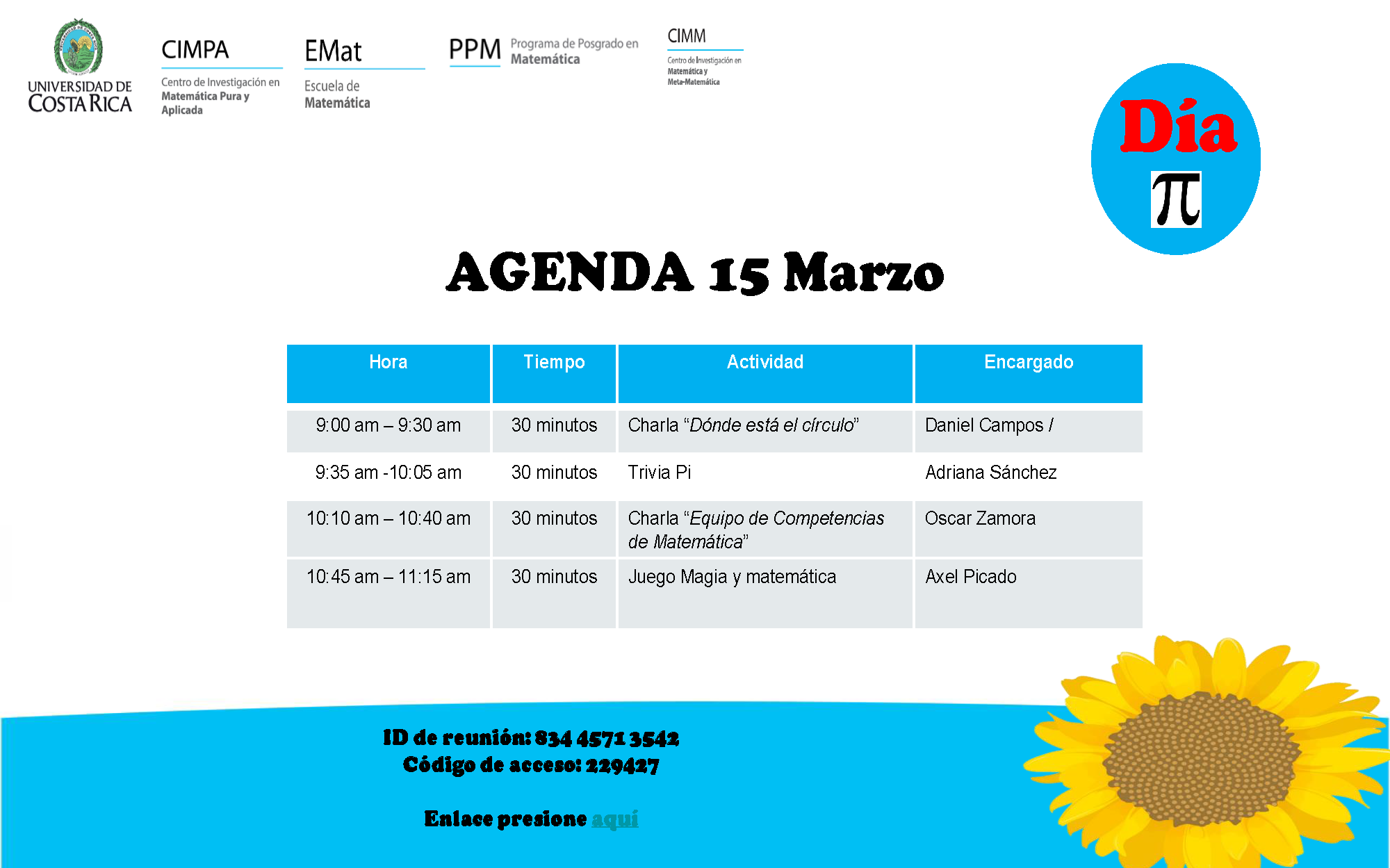 Te invitamos a celebrar el día Pi, se llevará a cabo este 15 de marzo a las 9:00a.m., tendremos charlas, dinámicas y entre otros, se realizará mediante la plataforma de zoom, con la siguiente información: