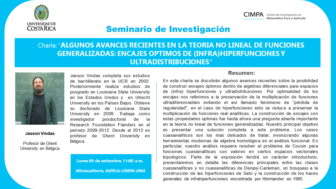 Seminarios de Investigación: "Algunos avances recientes en la teoria no lineal de funciones generalizadas: Encajes óptimos de (infra)hiperfunciones y ultradistribuciones" Felipe Escalante 06 Septiembre 2019